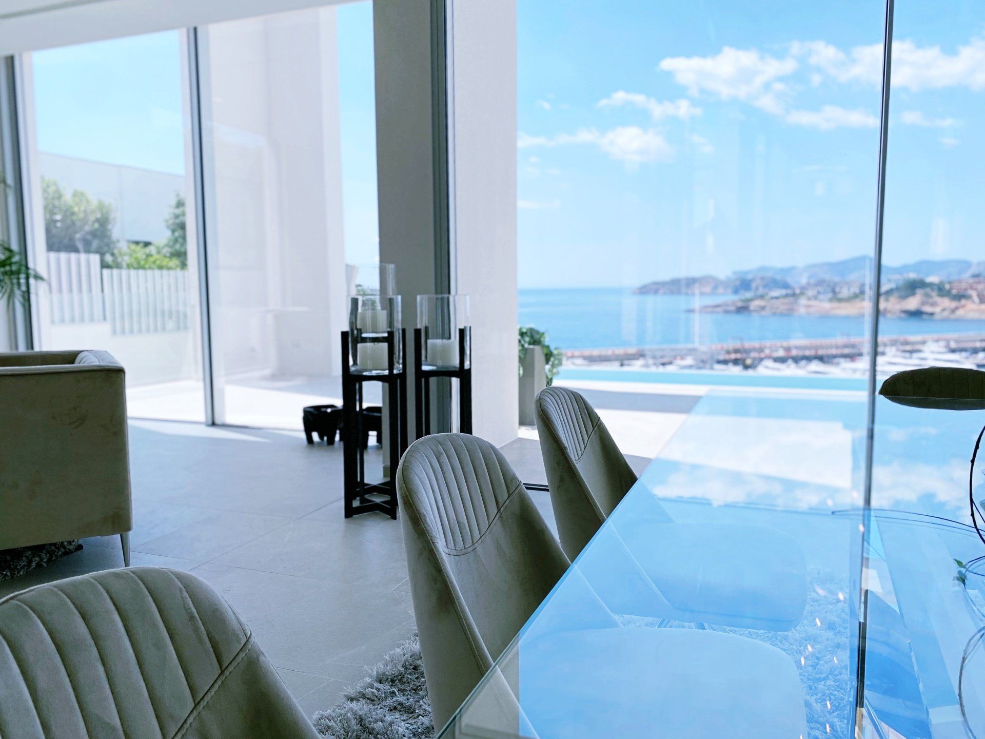 Erleben Sie jeden Tag ein Wow Gefühl! Panorama Meerblick mit Sonnenuntergang. Diese Moderne Luxus Villa in bester Lage oberhalb vom Hafen Port Adriano, mit einem unverbaubaren Blick auf das Meer, den Hafen und die Küste überzeugt durch ihre leichten, offenen, hellen Räume.