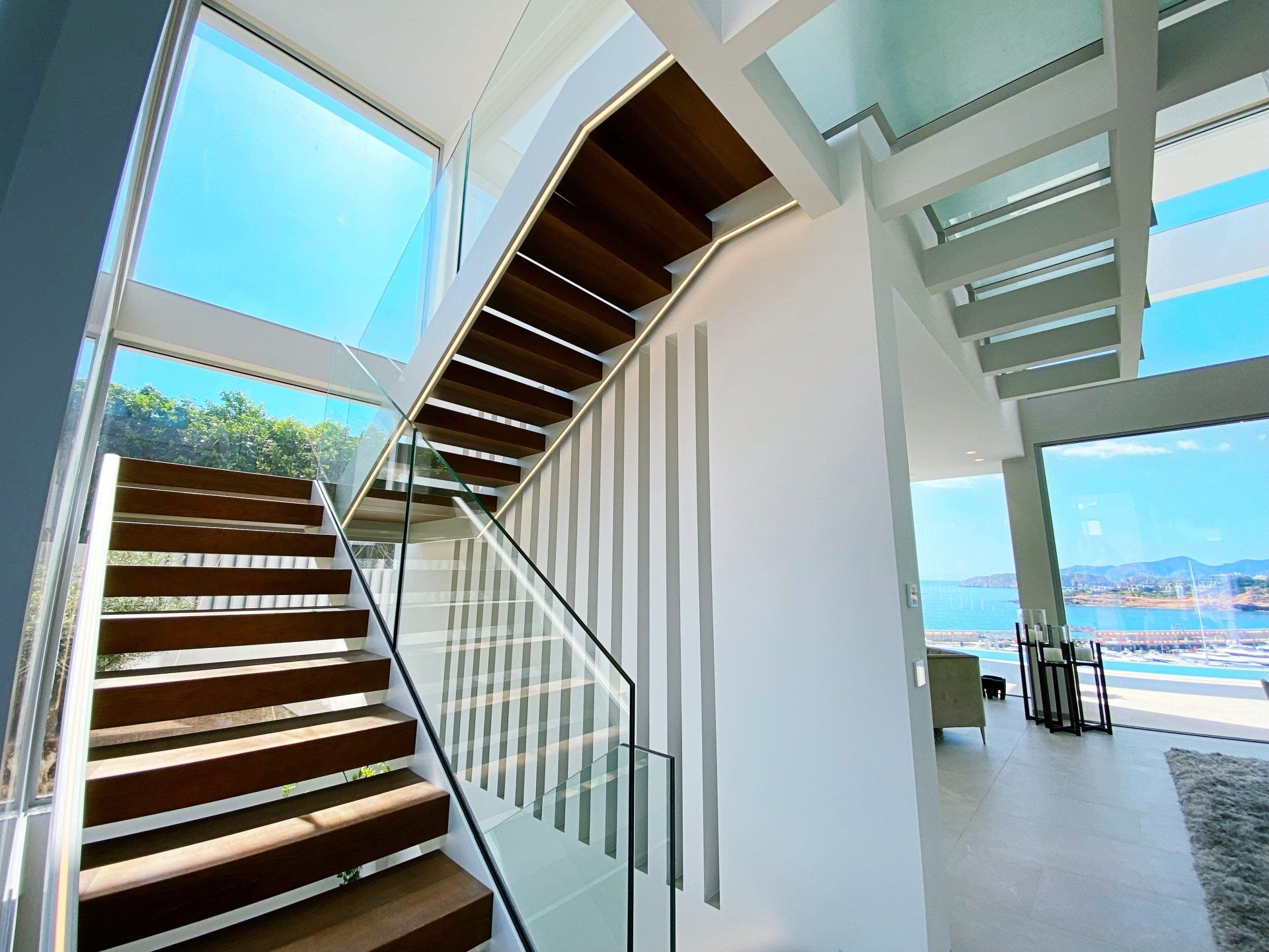 Die Etagen sind mit einem Glas Aufzug verbunden. Die Villa hat im Obergeschoss zwei Schlafzimmer mit Meerblick und Bad en suit.