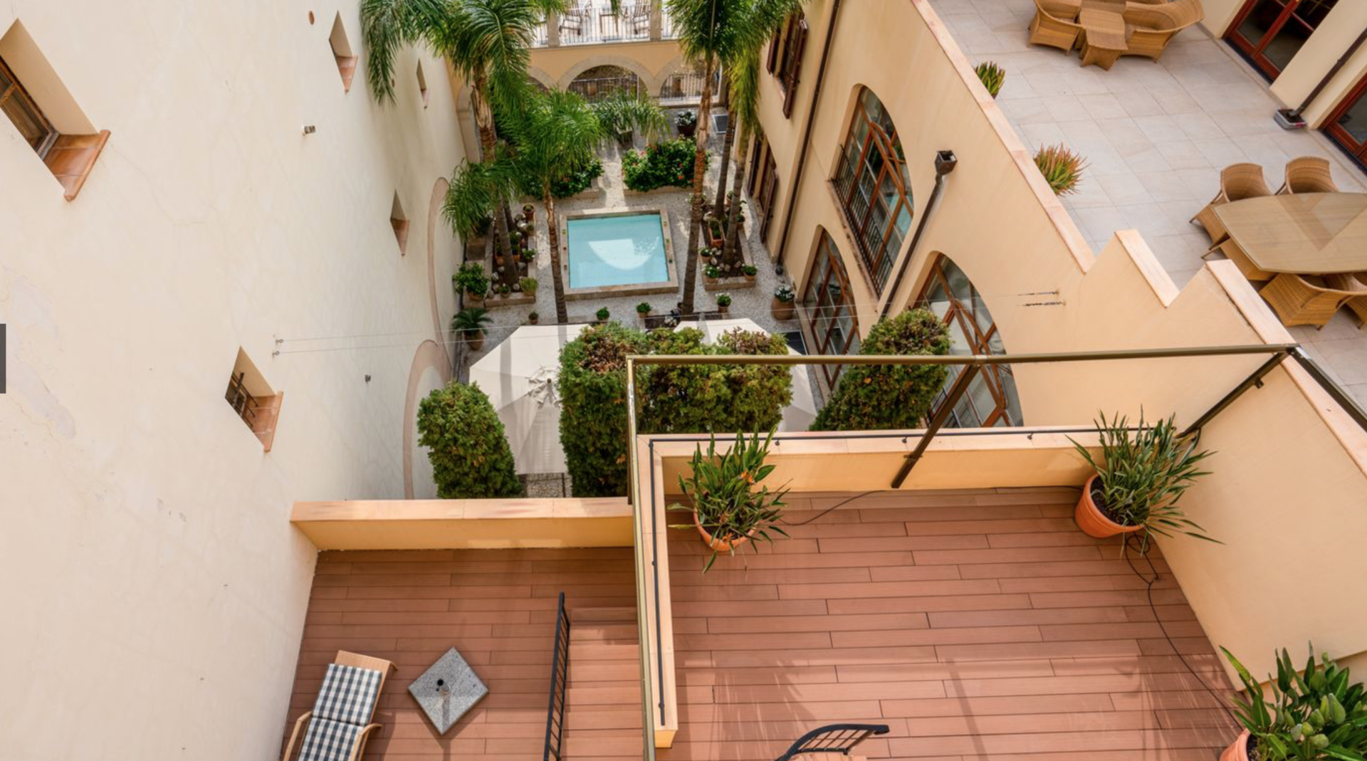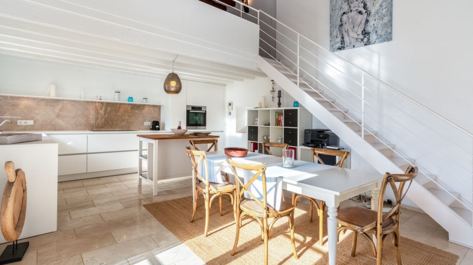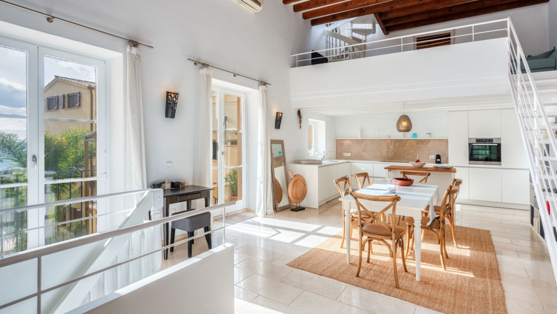 La casa adosada se extiende en varios niveles, conectados mediante escaleras o un ascensor privado. En el primer piso encontrará el vestíbulo con una maravillosa vista al jardín mediterráneo y las palmeras del patio interior, así como una habitación doble con baño en suite y un aseo para invitados. Encima se encuentra el dormitorio principal con baño privado y acceso a una terraza con vistas al jardín. En el 3er piso encontrará un amplio salón/comedor con una cocina abierta de alta calidad. Incluso aquí podrá disfrutar de mucho sol y luz, así como de las vistas al mar desde el sofá, la mesa del comedor y la cocina. Río arriba encontrará otra terraza con vistas al mar. Desde la galería se accede a la azotea de unos 50 m² con vistas de 360 grados a la ciudad, el puerto y el mar abierto. La propiedad incluye un apartamento de invitados en la planta baja con entrada independiente por dos lados (calle y patio interior). Desde allí se accede a la zona de bienestar del sótano con sauna, jacuzzi y baño. El apartamento de invitados y el apartamento en sí están conectados por un ascensor privado. Otras características incluyen mobiliario interior, aire acondicionado, calefacción por suelo radiante, suelos de piedra natural y doble acristalamiento.